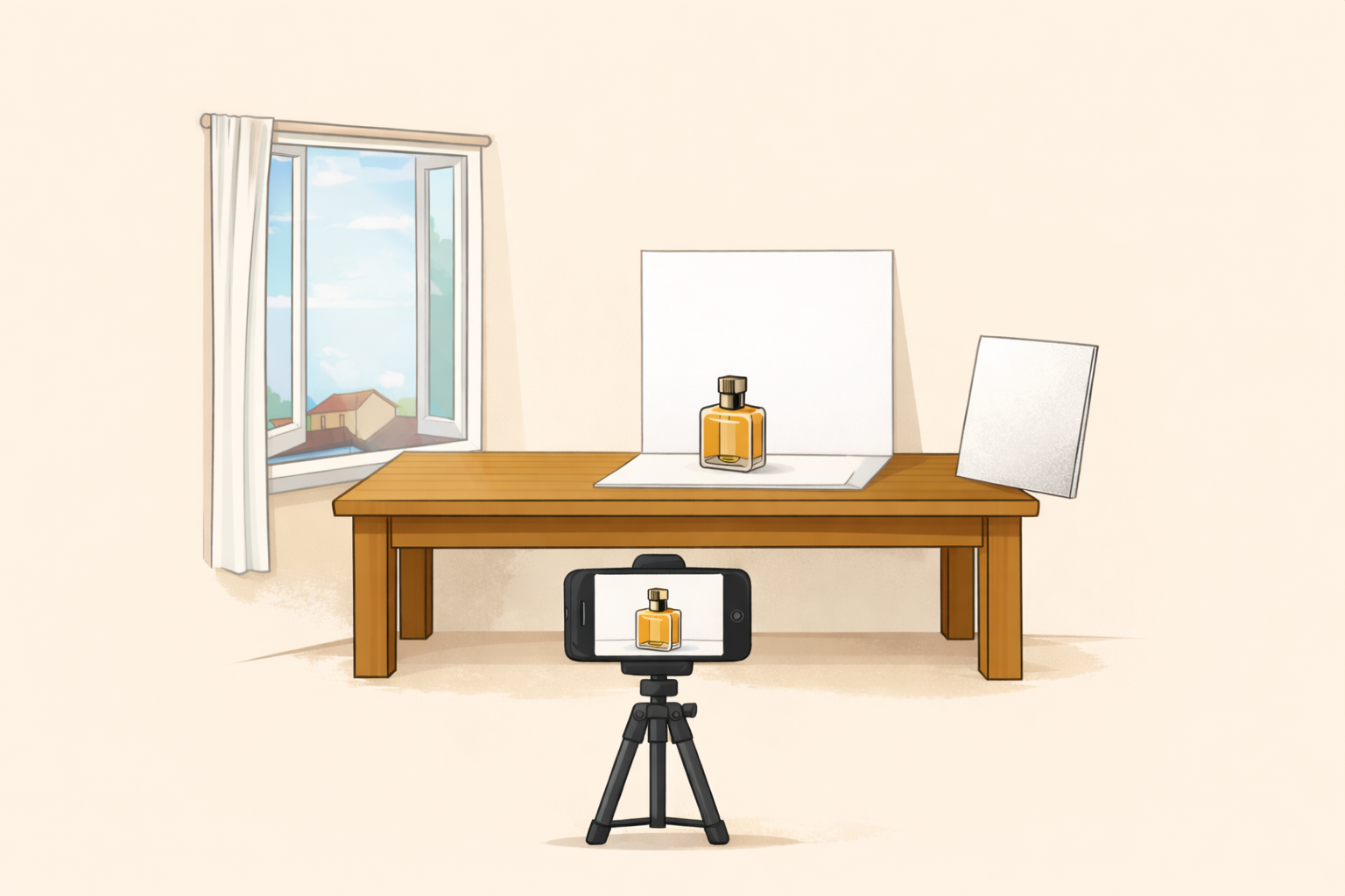 Coloque o produto de lado em relação à janela, para que a luz ilumine bem o objeto, e posicione a câmera de frente para o produto.